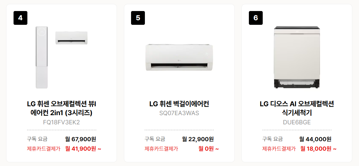 LG전자는 최근 프리미엄 가전을 월정액으로 이용할 수 있는 구독 서비스를 확대하며, 고객의 관심을 끌기 위한 다양한 기획전을 진행하고 있습니다. 특히 여름 시즌을 맞아, 냉장고, 에어컨, 스타일러, 정수기, TV 등 인기 품목을 중심으로 한 구독 할인 이벤트중입니다.
